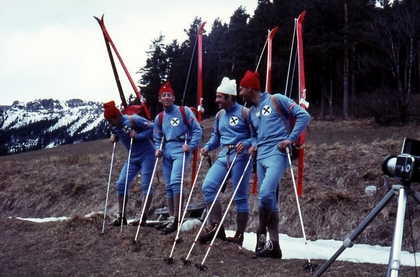 Klaus Hoi, Robert Kittl, Hansjörg Farbmacher und Hans Mariacher meistern die Überquerung der Alpen auf Skiern.